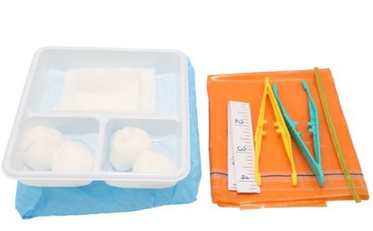 • Other: Content - 1 x Wrapping Drape (45 x 45 cm); 1 x Dressing Tray, 3 compartment, size S; 4 x Gauze Swabs (5cm x 5cm 8 ply); 4 x Gauze Balls; 2 x Gauze Swabs (7.5 cm x 7.5 cm 8ply); 1 x Waste Bag; 1 Ruler (60 cm); 2 x Disposible plastic forceps (10.5 cm)